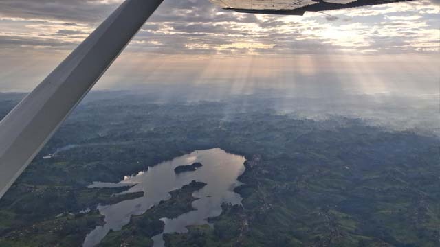 Soaring over Kenya’s scenic landscape—rivers, hills, and misty mountains framed by the aircraft wing
